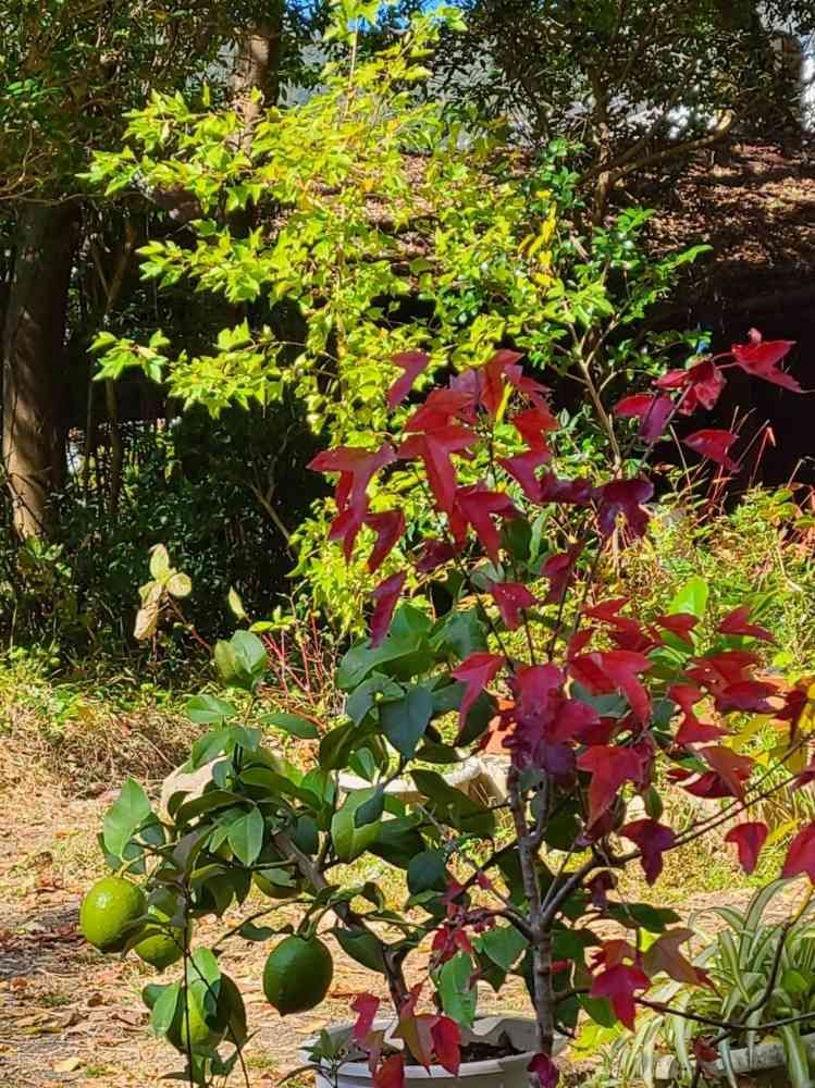 鉢植えは真っ赤なのに 地植えはまだ緑のまま。