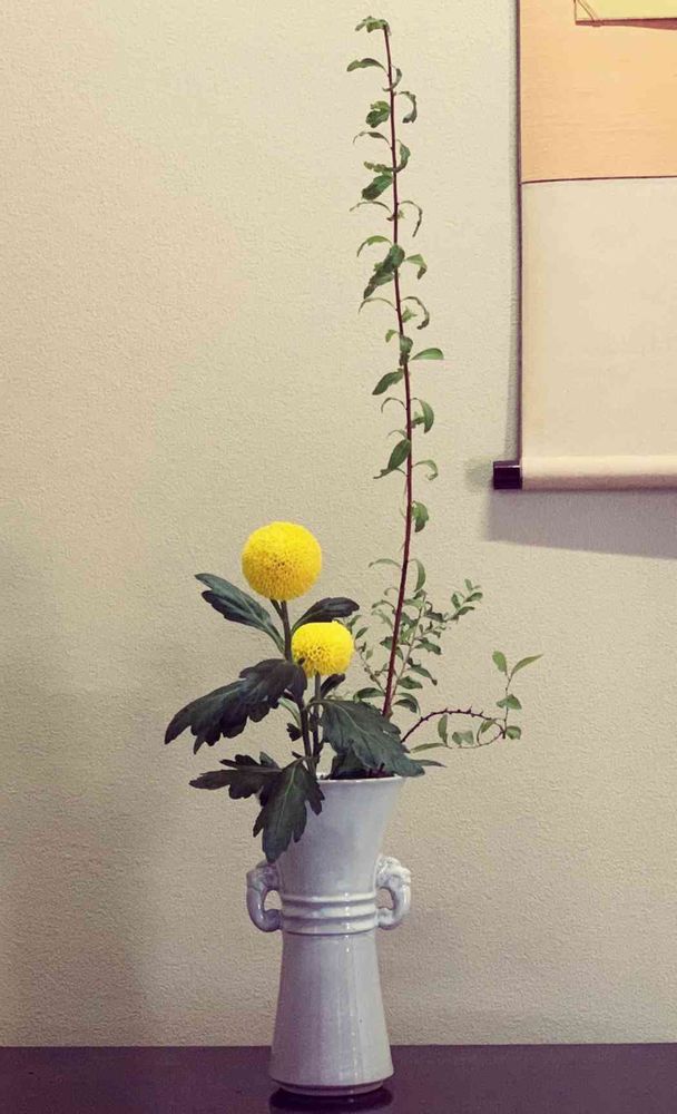 今回のお華の教室はオンラインになり自前で準備した華材で基本の形を意識して入れるという課題で。。。