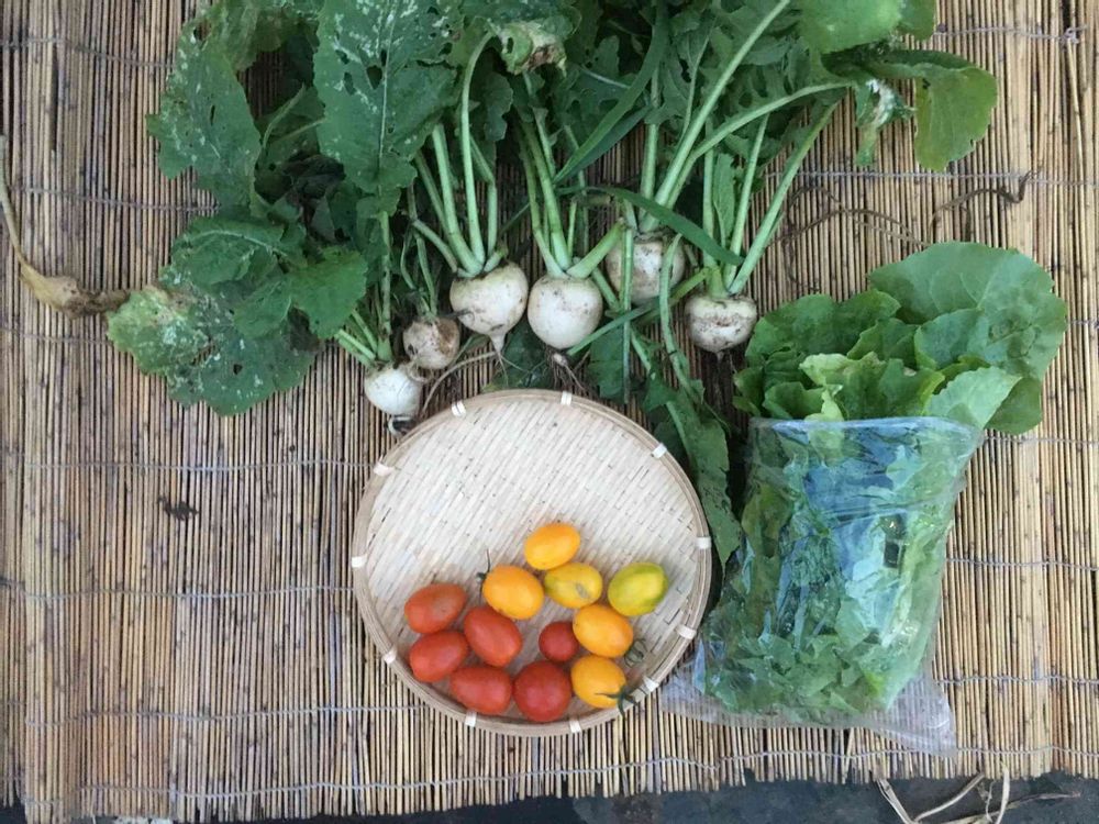 小カブ6個、チマサンチュ大量(写真は1袋ですが7袋収穫)、ミニトマト8個(アイコ4個は相方からいただきました)