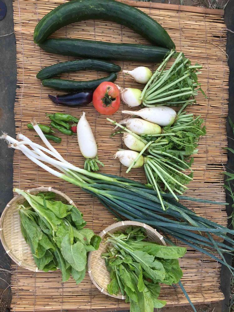 キュウリ4本、トマト1個、ミニ大根7本、長ネギ5本、ナス1個、シシトウ5個、チマサンチュ。