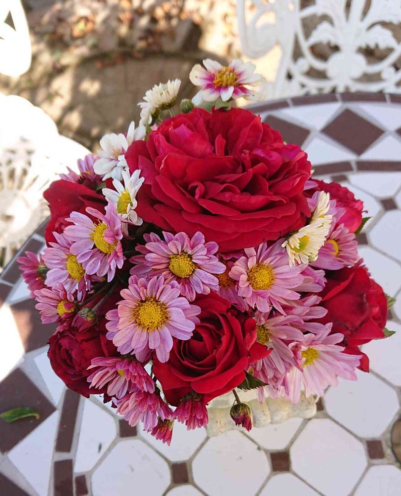 もうデイサービスに行くのに花束💐持って行くの当たり前に思っているみたいです😅 薔薇🌹が切れなくなったら小菊ね🎵と言ってるんですよ(〃艸〃)