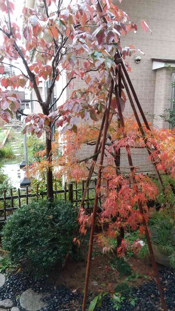 雪が降ってもぃいように🍁に囲いをしてもらいました!義父を講師に夫は、雪囲いに苦戦。来年は、私も覚えたいとお願いしました!雪国は、 何かと大変ですね‼️秋の坪庭に満足です💕