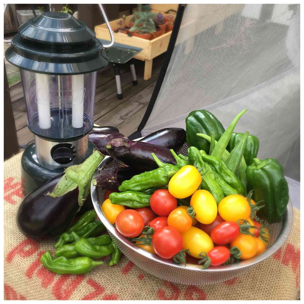 ミニトマトはたくさん種類を植えたので、色とりどり。シシトウも好調ですが、ナスとピーマンはいまいち。あ、きゅうり採り忘れた(● ˃̶͈̀ロ˂̶͈́)੭ꠥ⁾⁾