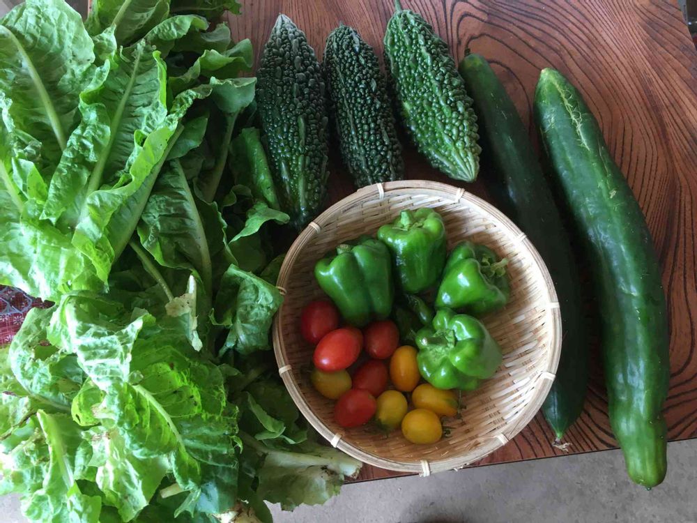 キュウリ2本、ゴーヤ3本、ミニトマトイエロー5個、リマサンチュ大量(テーブルにのらない)
