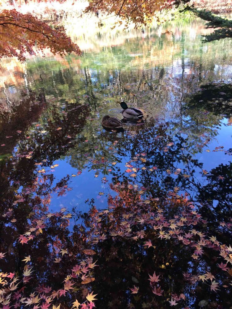 池に浮かんだ紅葉🍁も、カモも、絵になる‼️