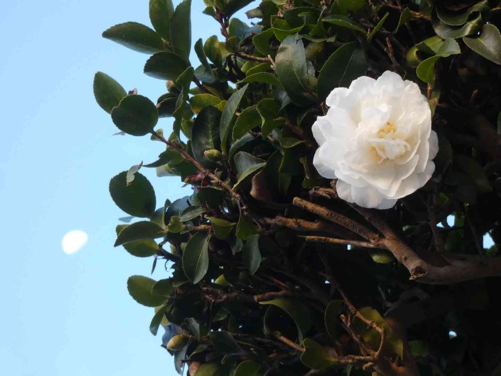 高い木🌳の山茶花を見上げたら、昨夜のお月様もご一緒してくれました。😉✨