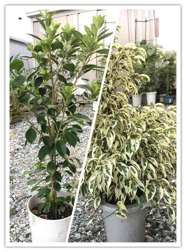 今日仲間入りのフィカスナナちゃんと斑入りベンジャミン・スターライト。