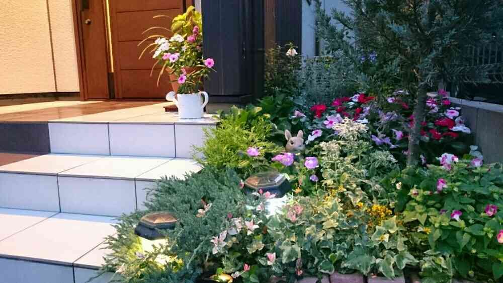 夜の玄関側の花壇🌼🌃 帰ってきたときにテンションの上がる玄関にしたいな~と思い試行錯誤中です😌