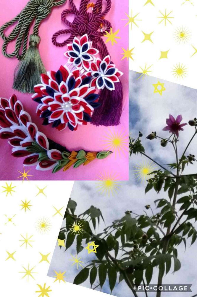 皇帝ダリア〜早いですね〜青空に映えるお花ですよね🌸我が家はジャングルのようになって、つぼみちゃんはまだないですね😰また、お孫さんの髪飾りステキです〜宝物ですね✨