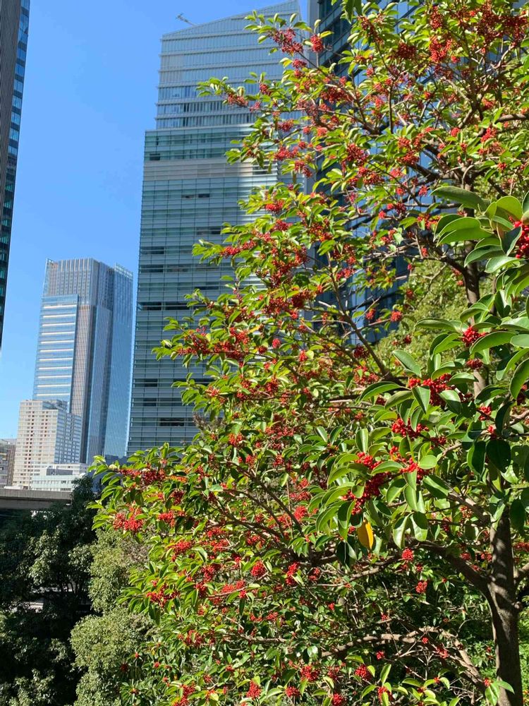 これは又普通に目にする組み合わせと違って、満開のキンモクセイとクロガネモチの実とのコラボは、都心のビル群にお似合いのスケールですネ~😻🐾🙆🏻👌✨💯✔💓🎶