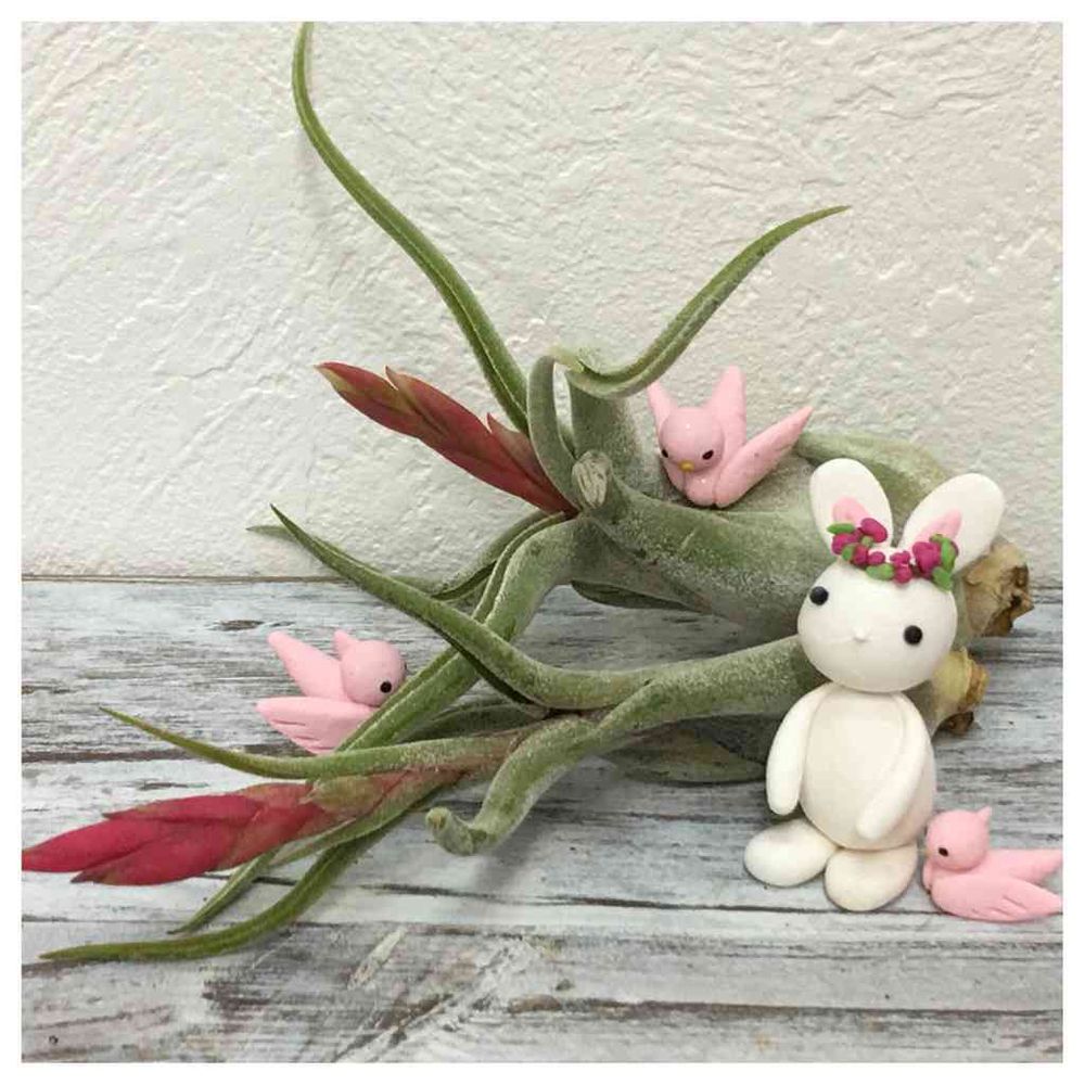 エアプランツ『カプトメデューサエ』と花冠ウサギ(直径5ミリの輪っかに花付けてます)🐰とピンクバード🦅