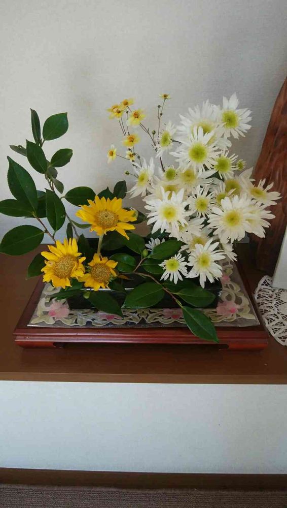 季節はずれのいただいた向日葵🌻最後に庭の椿とコラボしました😊夏かな秋かな冬かなー?