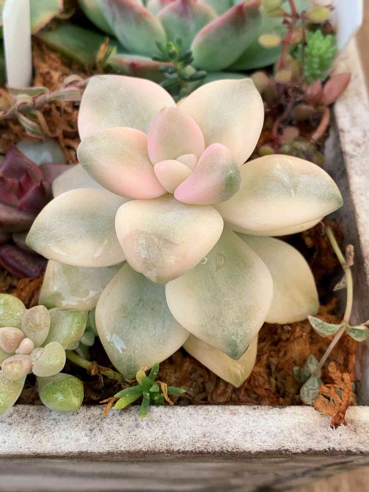 ベランダに放置し、1週間に一度水やりだけしているエケベリア寄植えコンテナを覗いてみたら、なんか可愛らしいお花、いや葉っぱが…