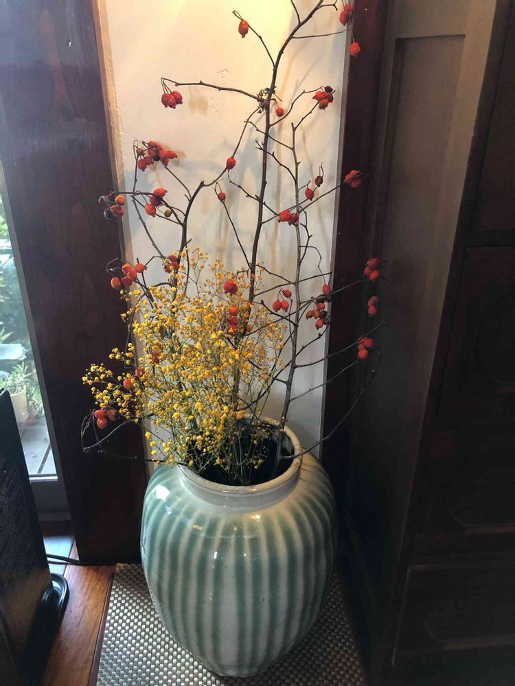 外に飾っていた壺を中に入れて飾ってみました😊冬はお花がなくなるので、春までこれで楽しみます🍁