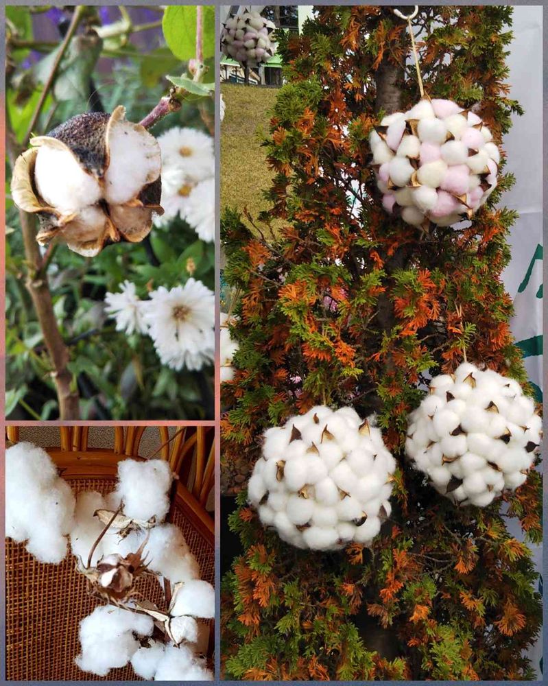 左上はウチの庭で、そろそろ弾けそうな綿