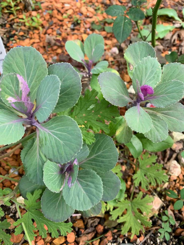 花壇の2年目葉牡丹ファミリーが紫付いていました。