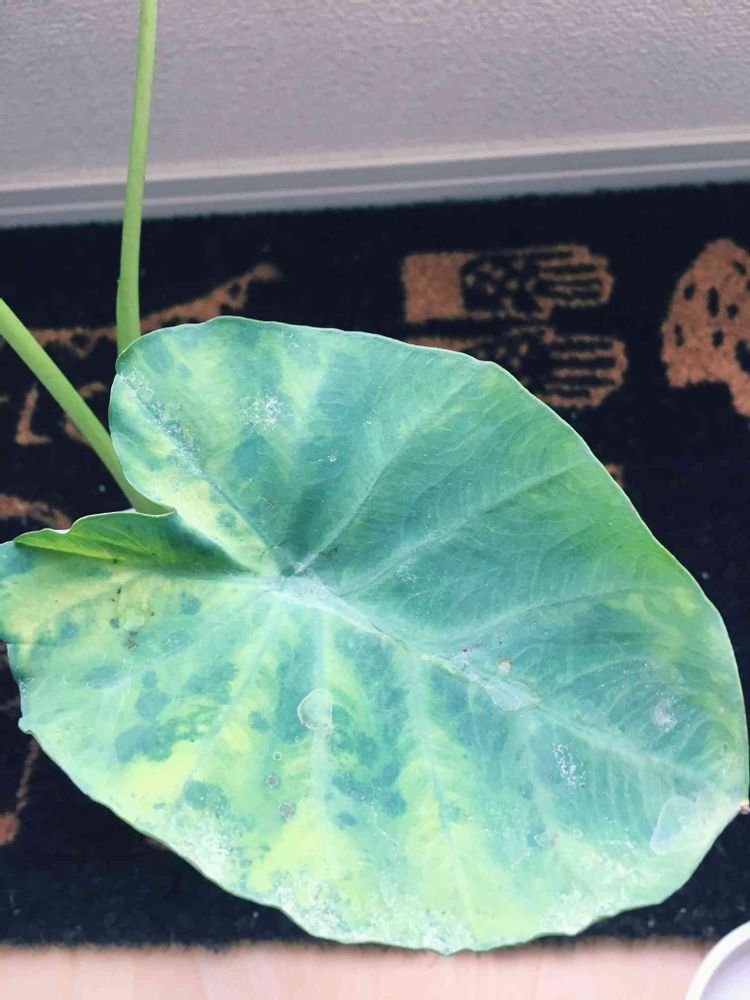 室内の里芋の葉。昨日までは綺麗だったのに今朝見たら1枚マダラ😢ハダニ付きやすいし💧