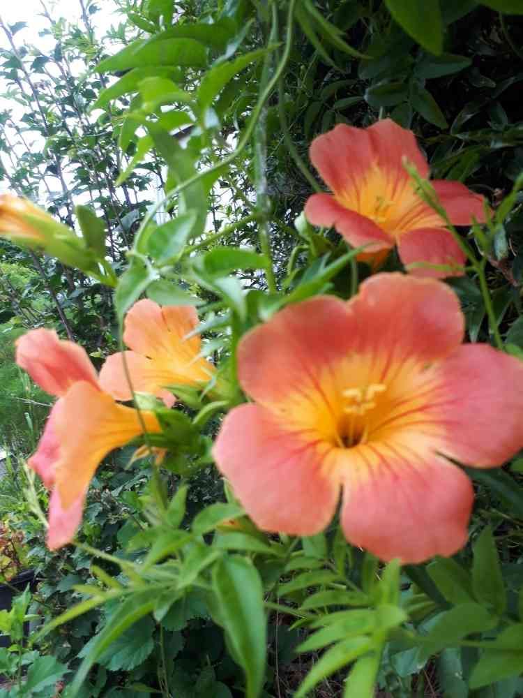ノウゼンカズラとジャスミンのつるがからまってます😆