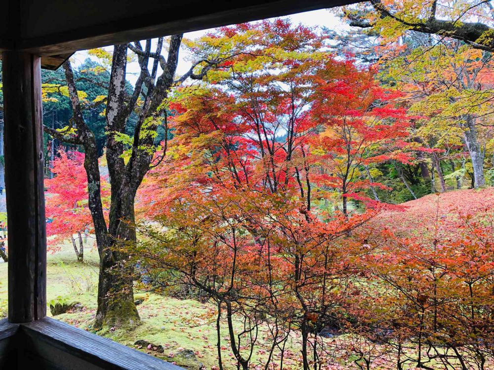 古峯園内の、美しい紅葉🍁🍂の中に立つ、東屋の窓越し‼️