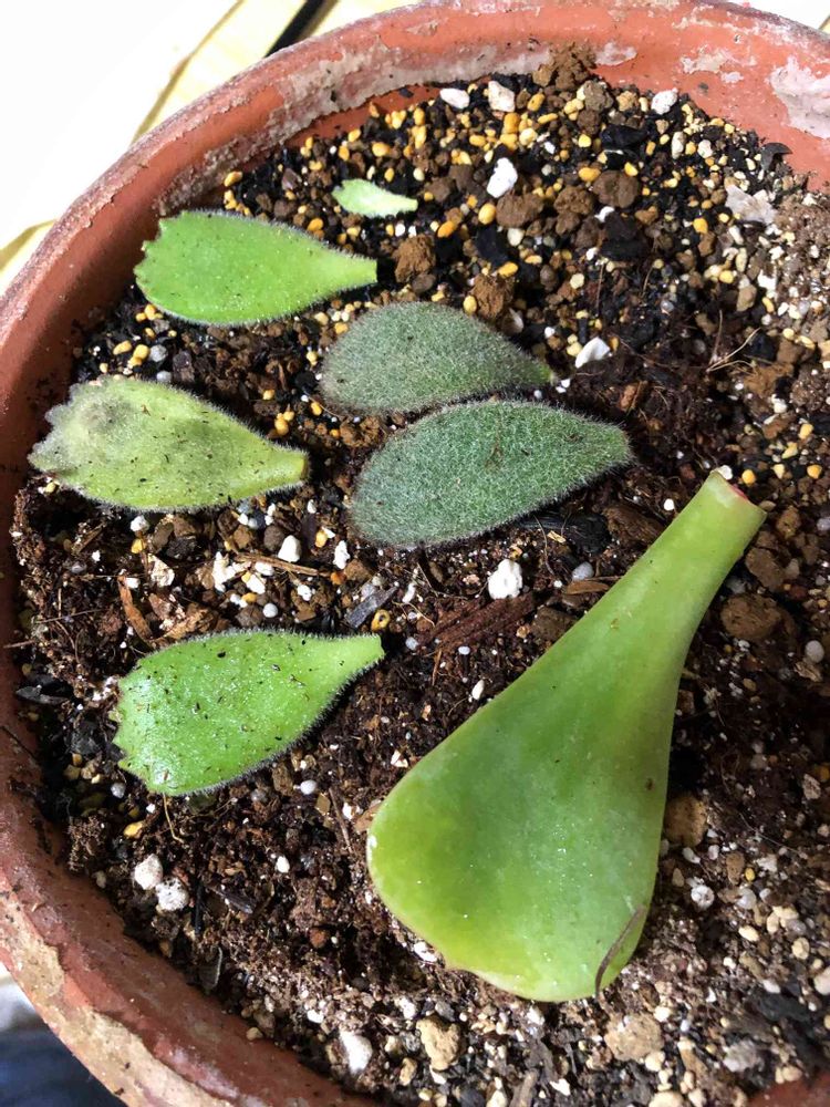 ヘロヘロで根元に葉が落ちてる熊童子を悩みながら買ってみた。家について鉢を置いた途端に大二枚、小一枚の葉がポロリ。