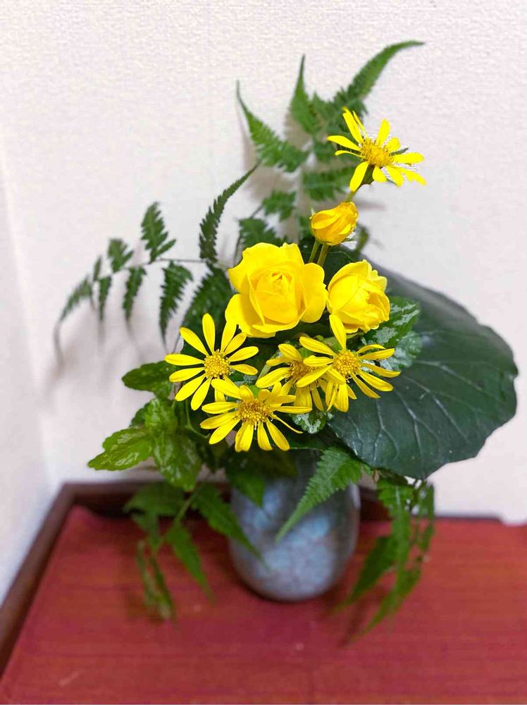 ツワブキさんも黄色のバラさんとこんな風にいけるとオシャレになるんですね〜💓