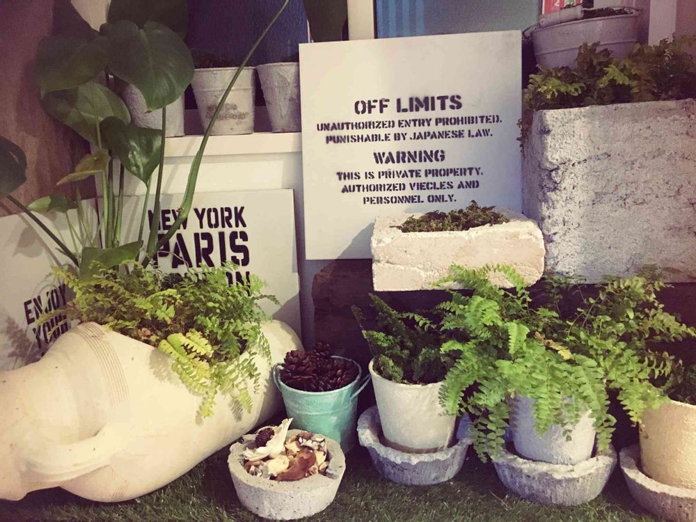 自作のモルタル鉢やリメ缶にグリーン植えてます。