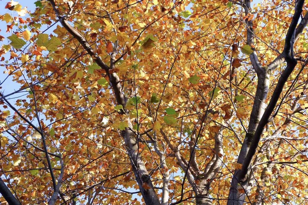 ユリノキ綺麗にこうようしてますね。別名はハンテンボク(半纏木)て言われるのは、葉の形が斑点を広げたように見えることからです。5月頃チュウリップに似た花を咲かせます。ただ、この木はかなり高く伸びるのと、花の色が緑なので目立たないこともあり、なかなか気づいてもらえないのです。私の大好きな花です。5月頃ぜひその大木を見上げてください🎶