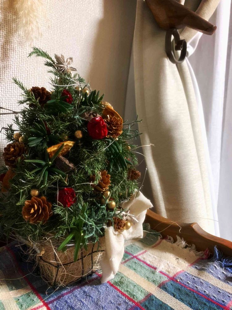 クリスマスツリー作りました。土台のワイヤーのカゴもリボンも全部手作りです❣️
