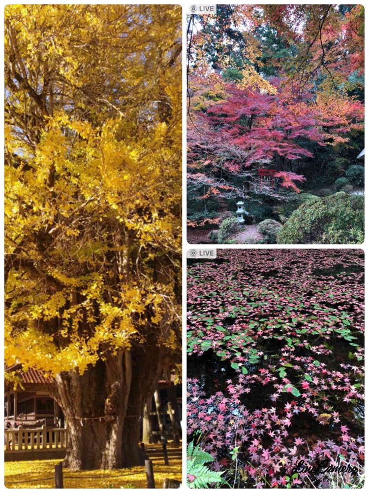 池に赤くなった紅葉や緑の紅葉が落ちていてきれいだったわね〜