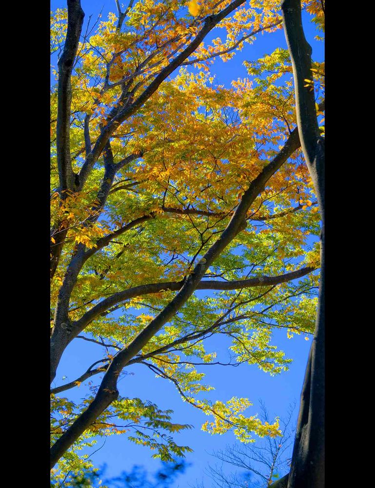 秋晴れの青空にケヤキの金色が鮮やかです。
