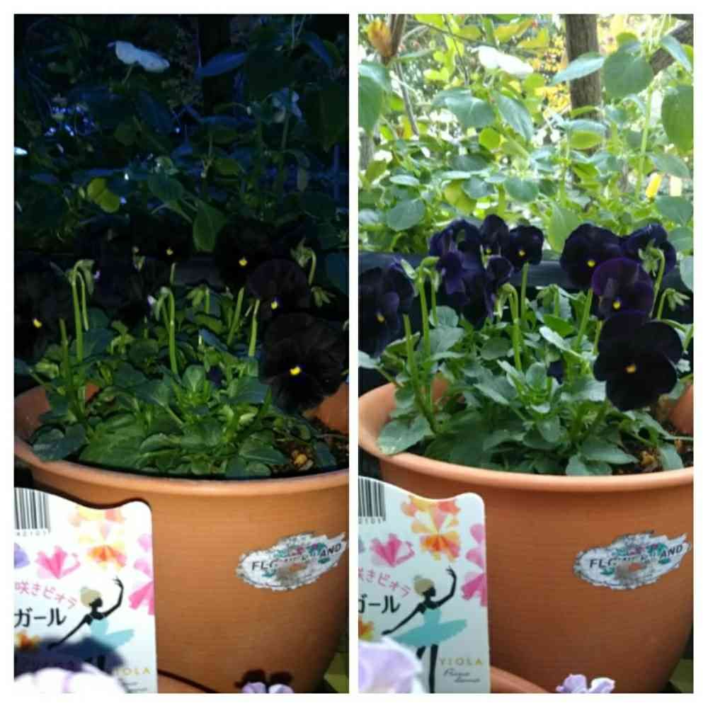 写真右…夜明け後の黒ビオラ