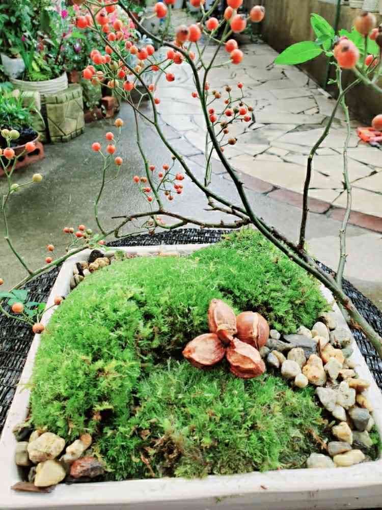 昨日の庭遊びは赤くなったイバラの実と肉厚の上質の苔で。