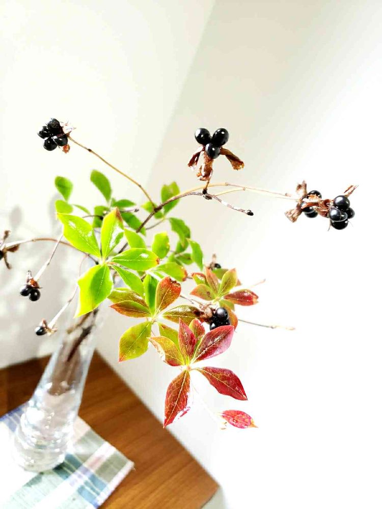 秋らしい庭の枝を飾りました✨この辺暖かいのでドウダンツツジの紅葉もまだやっと