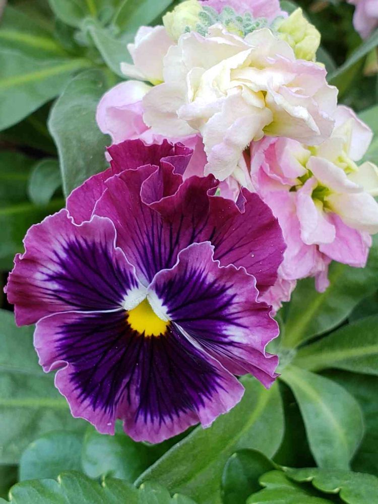 フリフリのパンジーと淡い八重咲きストックが可愛いですね💕
