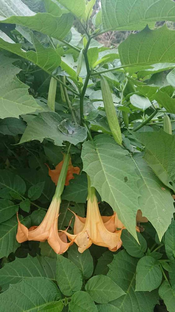 雨の中小さな小屋程の株のチョウセンアサガオまだまだ花もつぼみも残っています。🤗🎵➰🎵