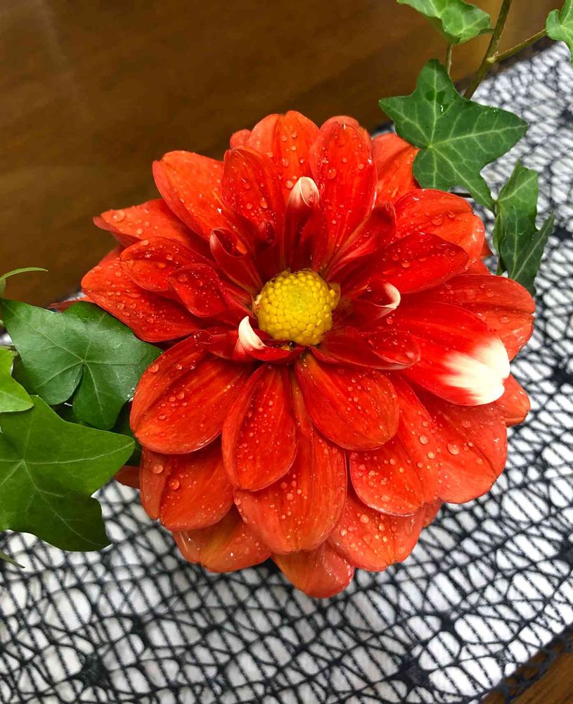 今朝のダイニングテーブルには、雨上がりで雫のかかったダリアさんを!