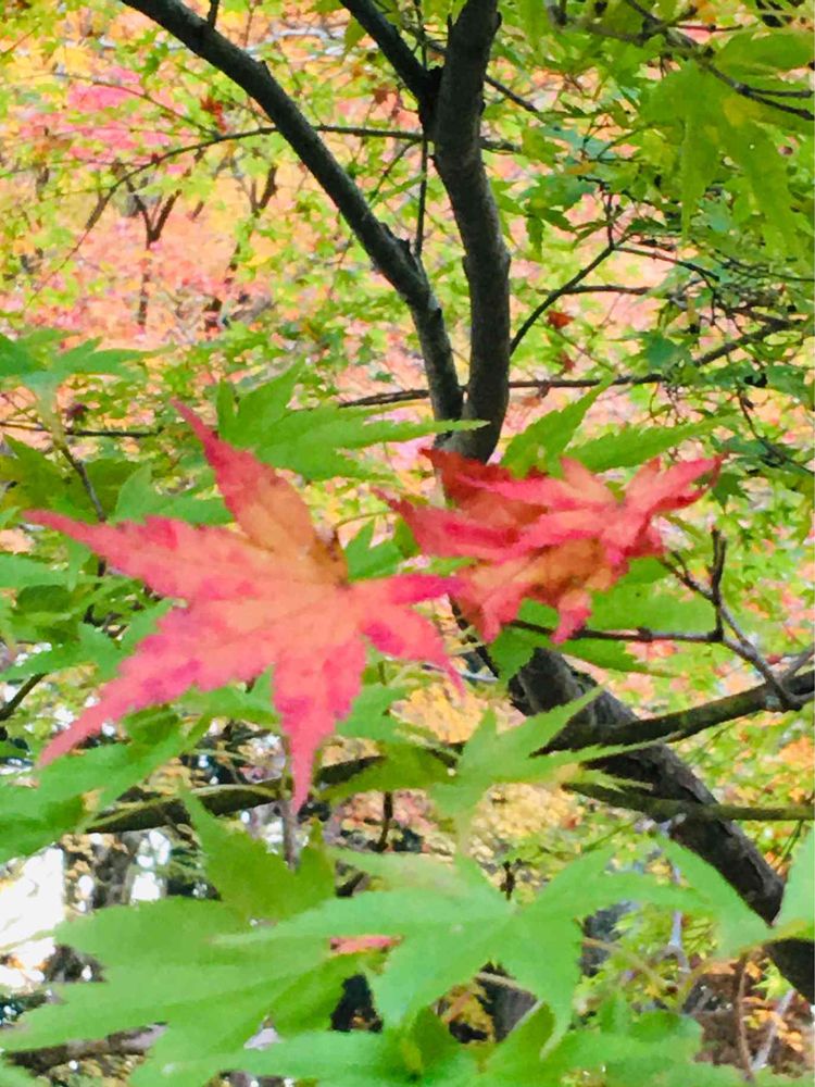 紅葉前の葉の上に 落ち葉🍁が乗っているのかと思ったら、この3枚だけが紅葉🍁していたのです💕 とっても不思議な気持ちで撮りました❣️