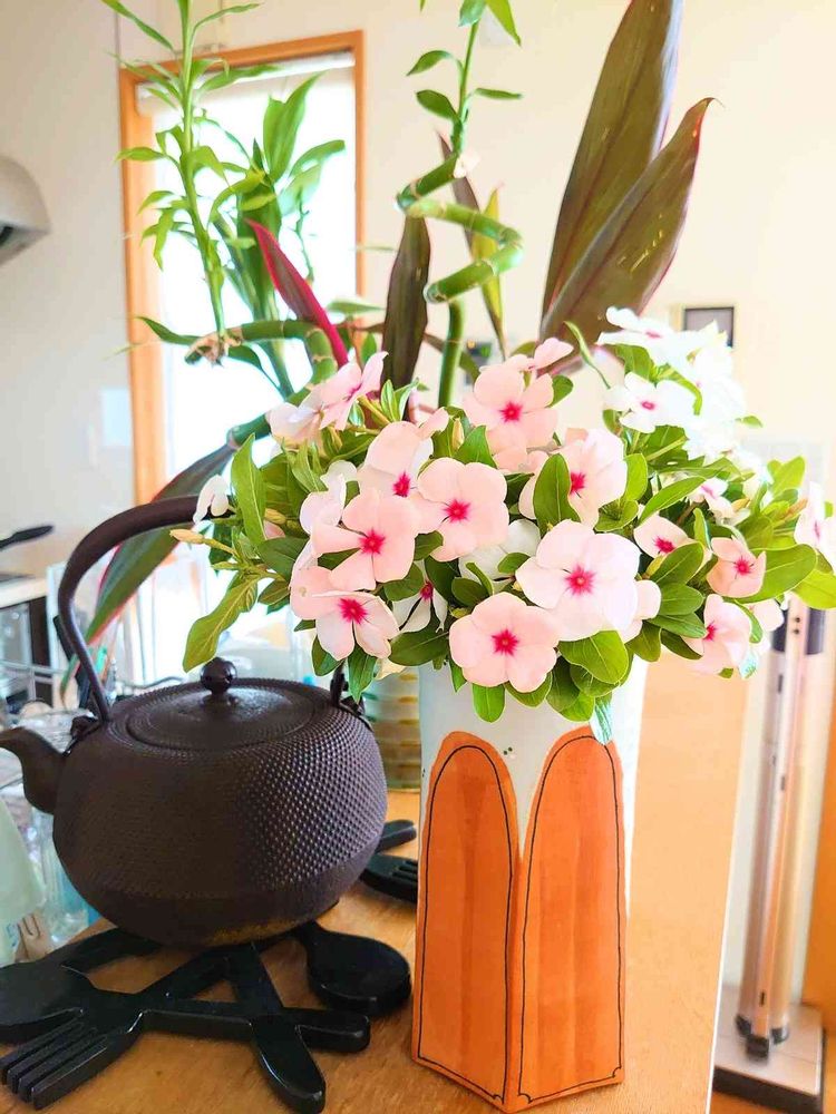 ニチニチソウのうしろに写ってるのは、いけばなで使ったドラセナがもったいなくて毎回放り込む専用花瓶です。もったいないオバケ。