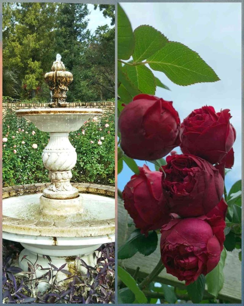 ピンクと黄色の薔薇に囲まれた広場、真ん中には