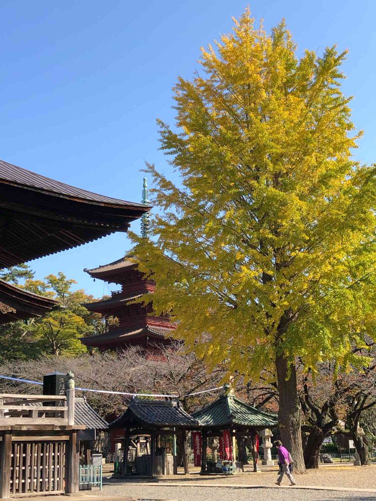 中山法華経寺境内、祖師堂前の大銀杏が黄金色に輝いていました。近くの鳴き銀杏は、まだ黄緑。