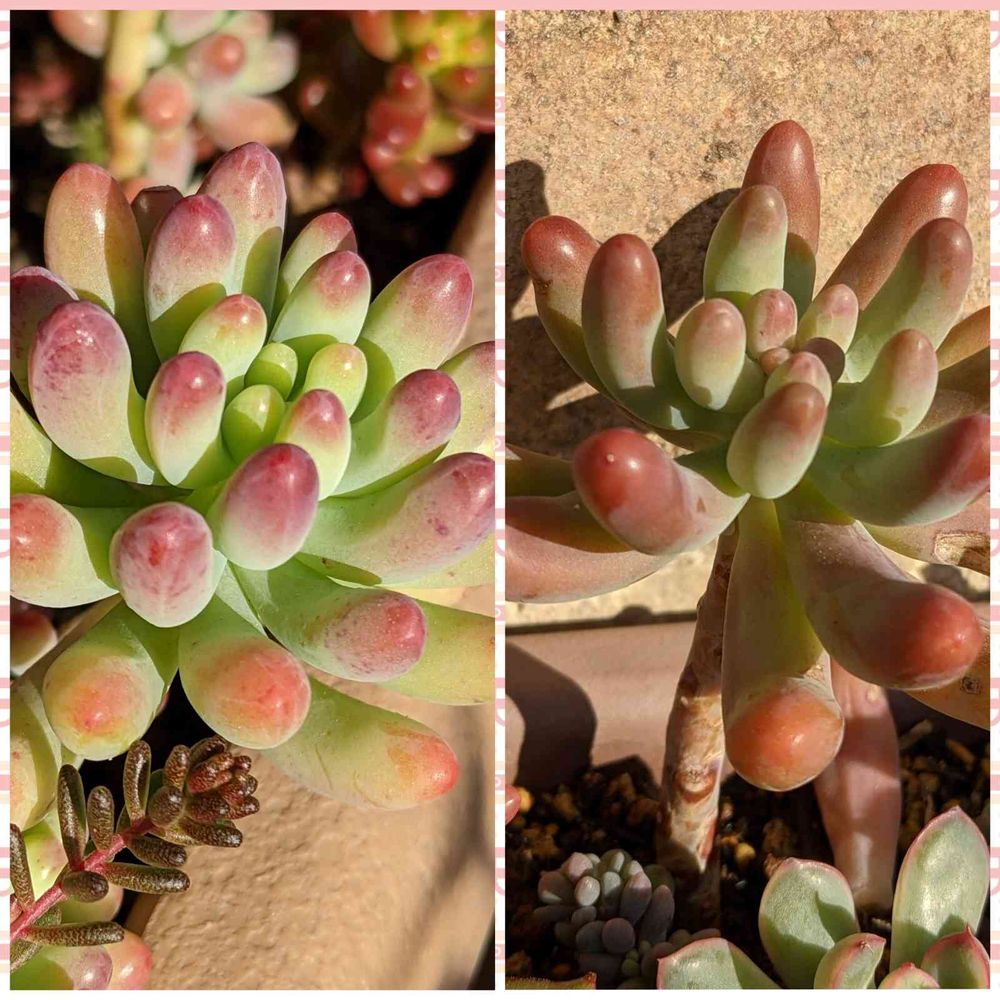 私もどこが、っていう決定的なポイントはわからないんですが、この2つは日当たり良好の屋外の同じ環境にあって、色づきが違うようですね〜。