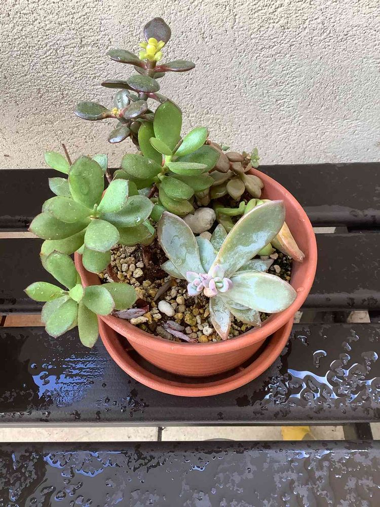 大きくなった多肉たちを寄せて、外に放置している寄せ植えです。