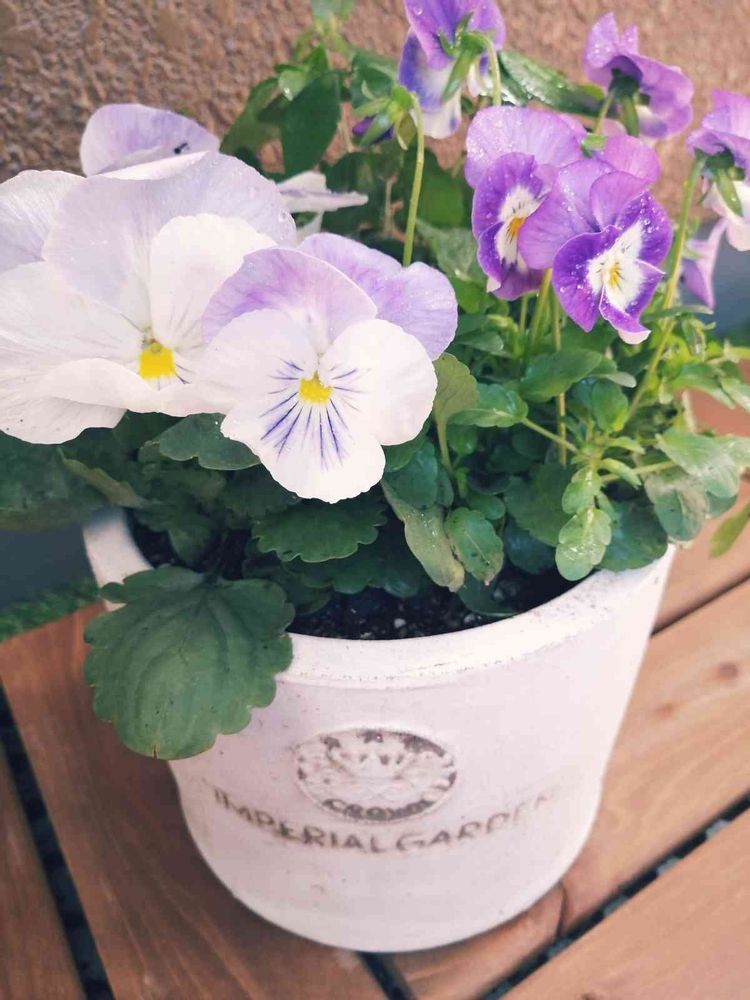 色味がド好みな白と薄い紫ツートンのパンジー、と紫のビオラ、