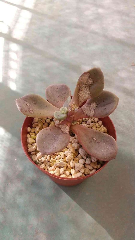 だいぶ大きくなったね。写ってないけど葉挿しも2つ、いい感じになってるし。あとはこの傷んだ葉をどうするか…(∵`)何か害があるなら取ろうと思ったけど、表面が傷んだだけで他には影響なさそうなんだよな。