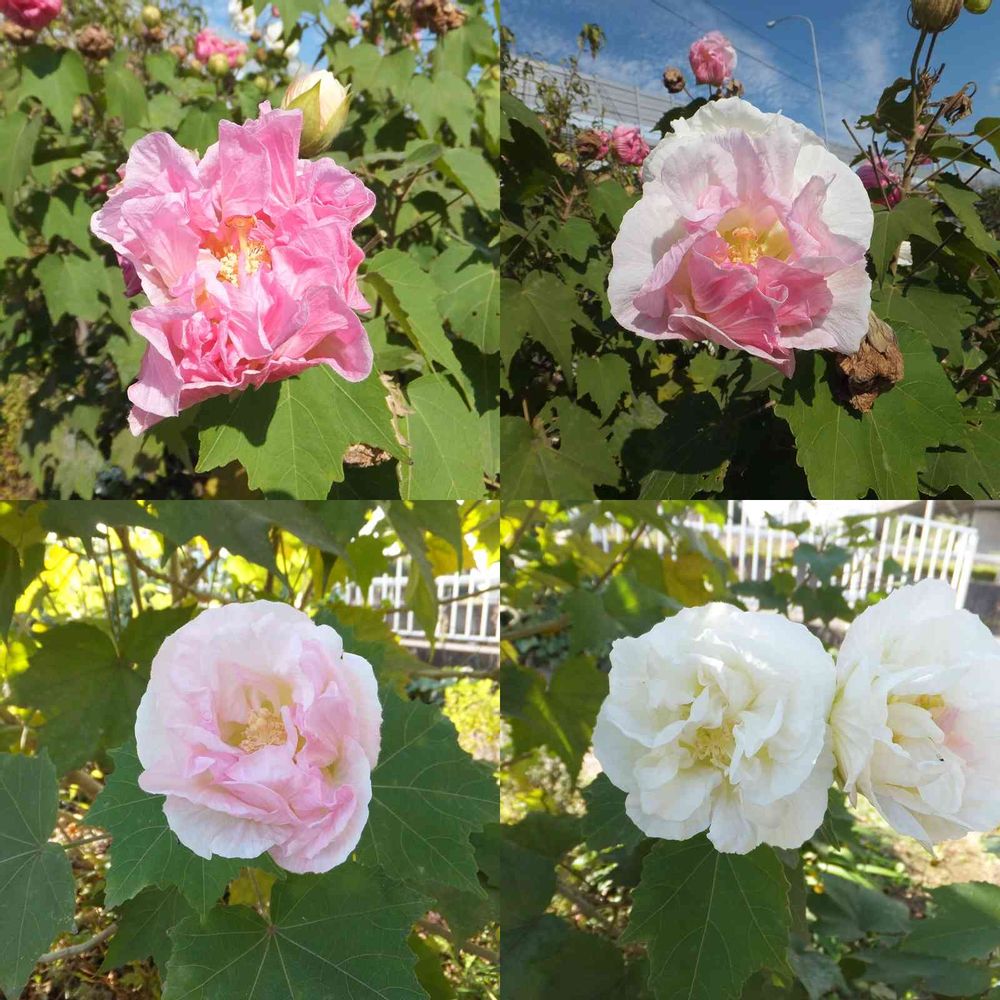 お散歩途中。 昼頃、酔い具合が異なる「スイフヨウ」が同時に咲いていました。パチリ・・・パチリ