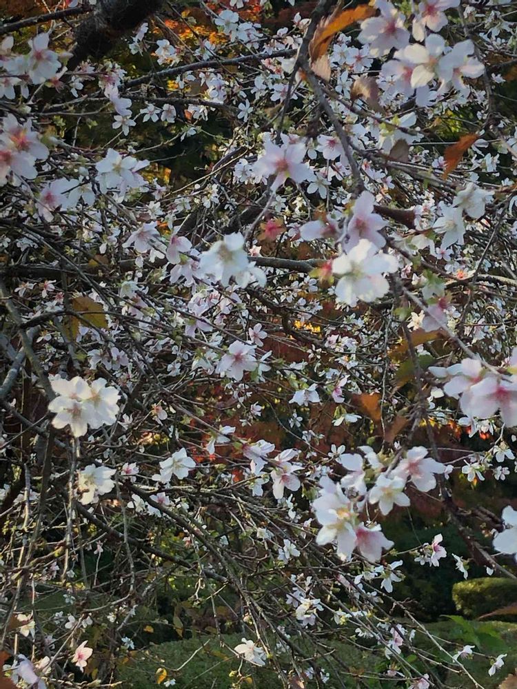 私も初めて見ました。滋賀の湖東三山 西明寺の不断桜です。もっと細やかに咲いているのかと思っていたのですが、満開状態で驚きました。細めの枝ぶりで垂れている様にも見えますねが、枝垂れ系では無かったですね。