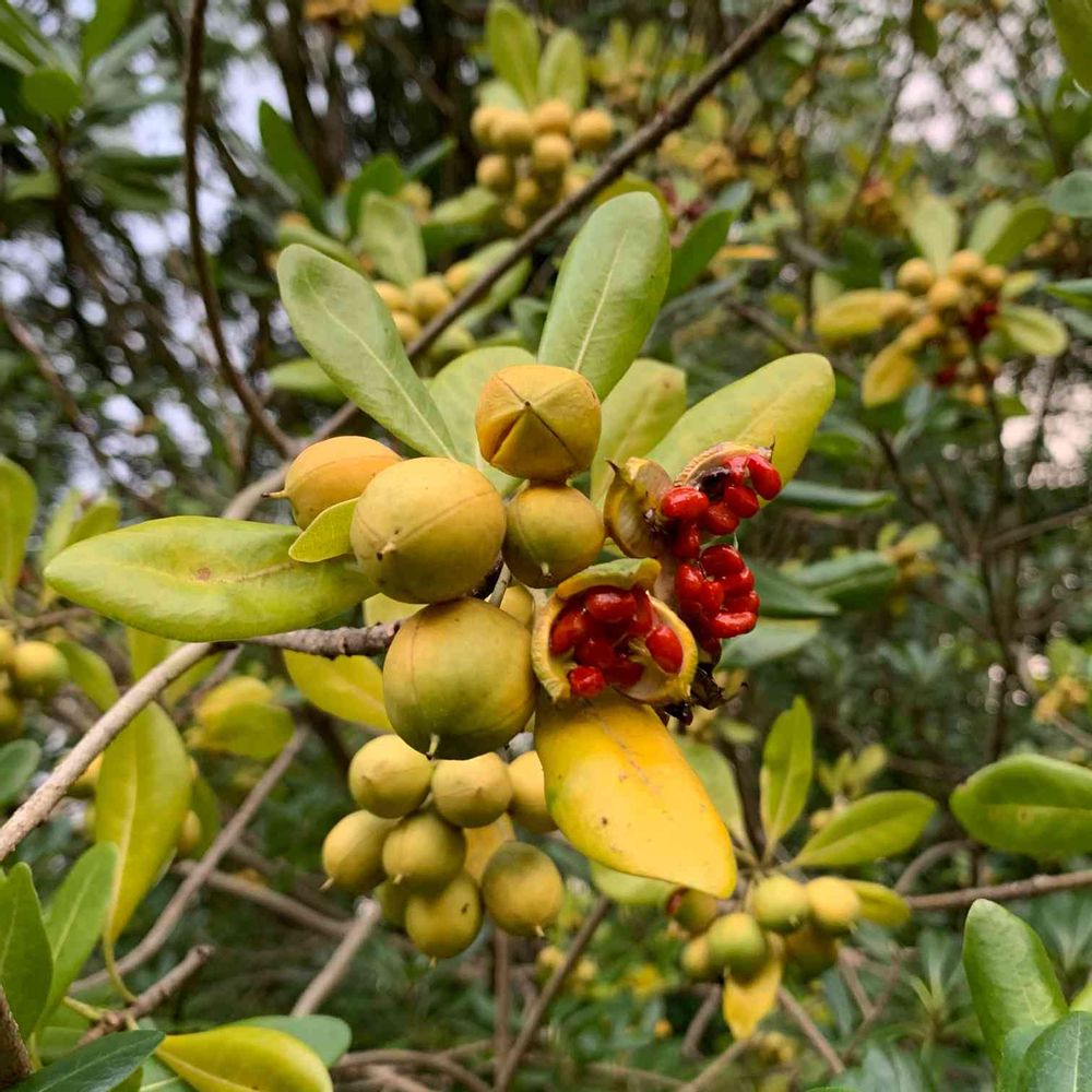 黄味がかった果実が割れて赤い鮮やかな実が顔を覗かせています😲