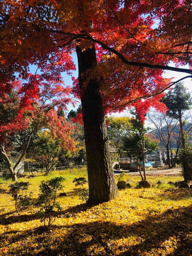 イチョウの木の落葉ともみじの真っ赤な紅葉のコントラストが素敵でした😊