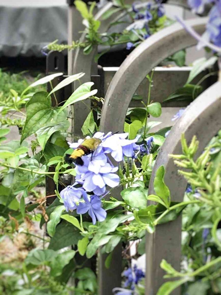 見えますかね、空飛ぶエビフライ🍤ことオオスカシバさん。花の蜜を吸おうとホバリングを繰り返しているのですが、あんまりないみたいです(○︎´艸`)