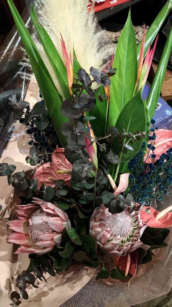 今朝のpicは昨日アレンジメント教室の花の店にお買い物した時にこの花束がちょうど出来上がったところであまりにキングプロテアが素晴らしくて素敵な花束だったので写メさせてもらってきました👍❣️